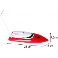 Glid over vandet med denne kompakte racer i rød og hvid. Den vandtætte fjernstyrede båd kører op til 20 km/t og har en rækkevidde på op til 20 m, så du kan lege ved sø, pool eller bassin. Modellen er nem at styre med 4 kanaler og er velegnet til unge og voksne, der vil prøve kræfter med vandmotorsport.